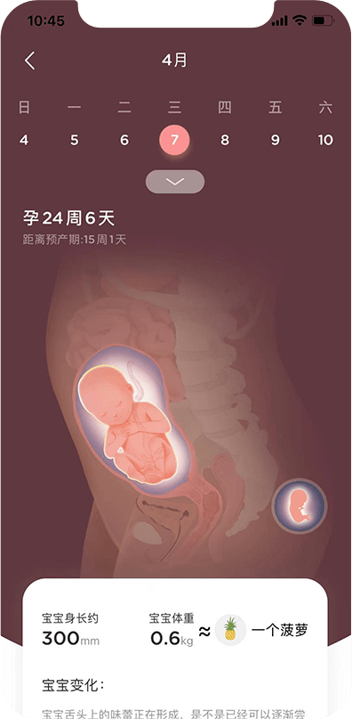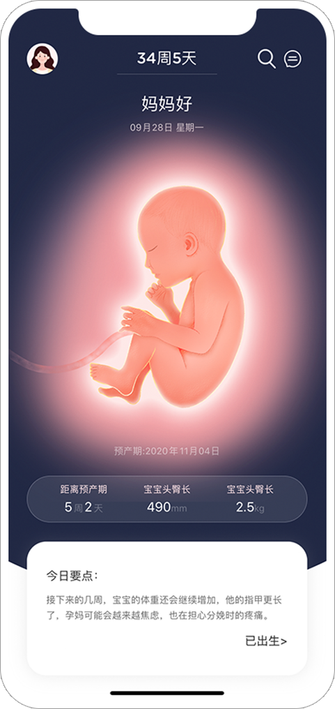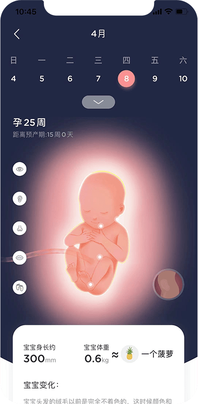 로그인 당시 입력된 정보에 기반하여 예상 출산일 D-Day, 태아 크기, 체중 및 태아의 변화 등을 계산하여 알려줍니다. 태아 발달 변화 데이터는 총 510개의 이미지를 통해 태아의 주차별 및 부위별 발달 변화, 오감의 발달 시기 등을 시각화하여 알려줍니다.
