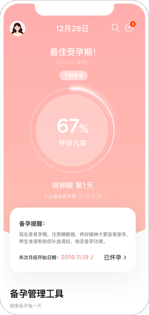 배란 캘린더로 당일의 임신 가능성(%)을 확인하고 일일 주의사항 컨텐츠(임신 전 가이드, 혈당관리 등)를 제공하여 임신 가능성을 극대화할 수 있습니다.