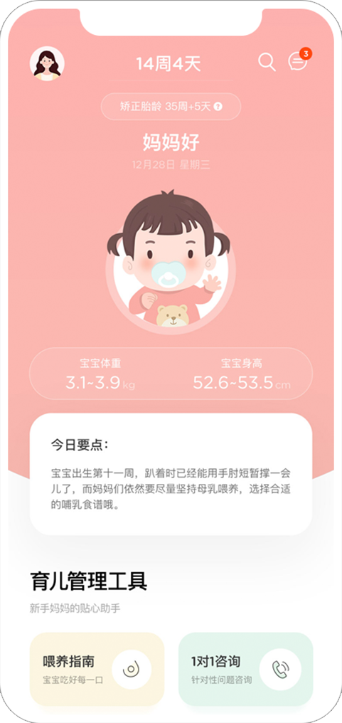 출산 예정일에는 출산 여부의 자동 노티와 함께 사용자의 상태는 ‘출산 후’ 단계로 전환됩니다. 육아, 모유 수유, 건강 식단 등에 대한 유용한 육아 정보 컨텐츠를 제공하며, 아기의 발육 상황을 주차별로 제공합니다.